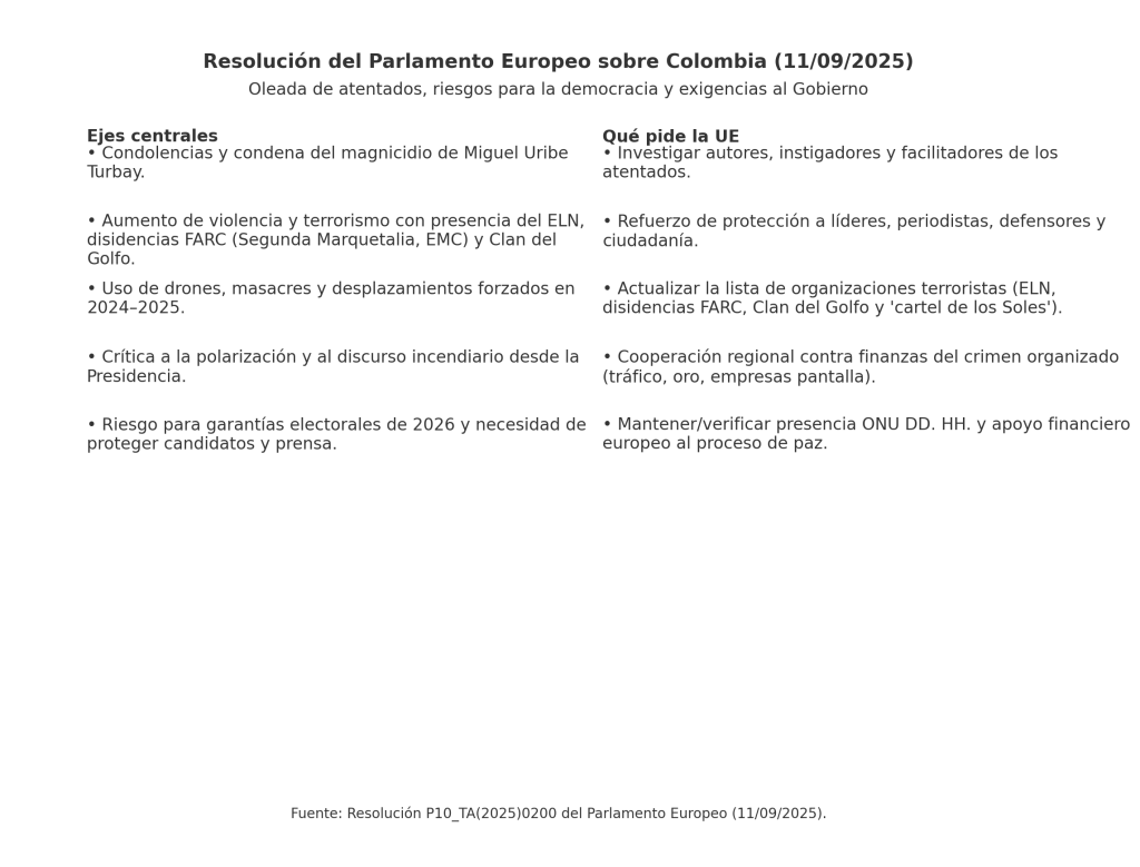 El Parlamento condena el asesinato del senador Miguel Uribe Turbay, contextualiza una ola de atentados y establece un vínculo entre el avance de grupos armados y una retórica oficial polarizante que deteriora el clima democrático. También exige investigaciones a fondo, protección efectiva a líderes y periodistas, y actualizar la lista europea de organizaciones terroristas para incluir a disidencias de las FARC, el Clan del Golfo y el llamado “cartel de los Soles”.