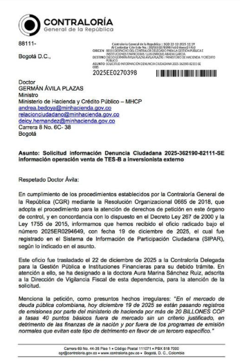 Hasta ahí, podría tratarse de una decisión discutible o defendible —según el prisma— en medio de la estrechez fiscal. El problema empieza cuando el mismo episodio, en paralelo, llega a la Contraloría General de la República (CGR) mediante una denuncia ciudadana, y el órgano de control envía un oficio al ministro Germán Ávila pidiendo explicaciones sobre la operación, bajo la sospecha de que pudo haberse ejecutado por debajo del mercado y fuera de los programas normales de emisión, con potencial detrimento para las finanzas públicas.