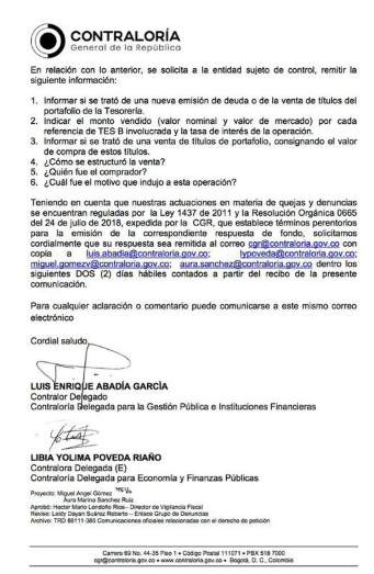 Y lo más sensible: la denuncia, según el oficio, menciona presuntos hechos irregulares como una venta “fuera de mercado” y con un diferencial de 40 puntos básicos frente a la tasa de mercado, además de una cifra (en la carta se habla de $20 billones) que no coincide exactamente con los $23 billones difundidos públicamente, lo cual exige aclaración técnica (¿nominal vs. efectivo?, ¿tramo vs. total?, ¿valor en COP vs. equivalencias?).